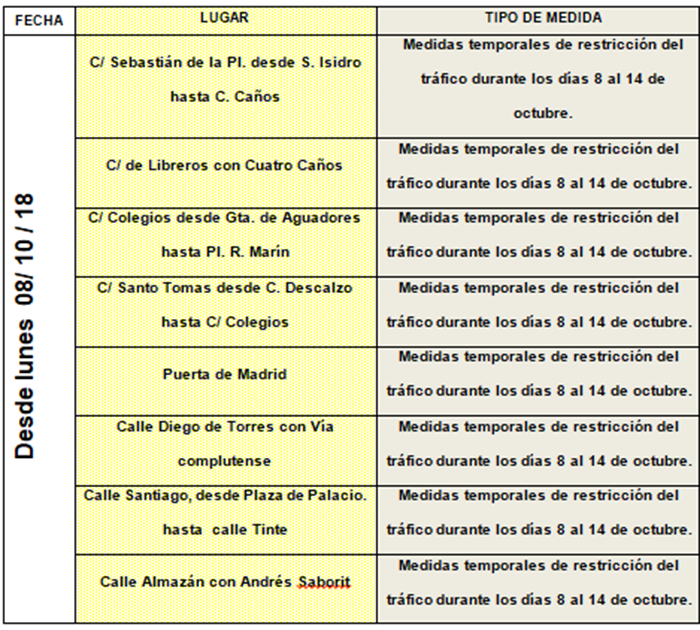 El Mercado Cervantino implicará importantes y necesarias restricciones de tráfico y estacionamiento en el entorno del Casco Histórico. Estas limitaciones se llevarán a cabo desde el lunes 8 de octubre hasta el domingo 14 de octubre, ambos incluidos.