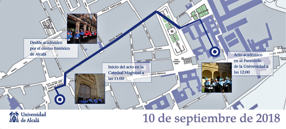 A continuación la comitiva realizará su ya tradicional recorrido por el casco histórico de Alcalá de Henares hasta el Paraninfo del Colegio de San Ildefonso, tal y como hicieron los bachilleres en su primer día de clase, hace ya más de 500 años.